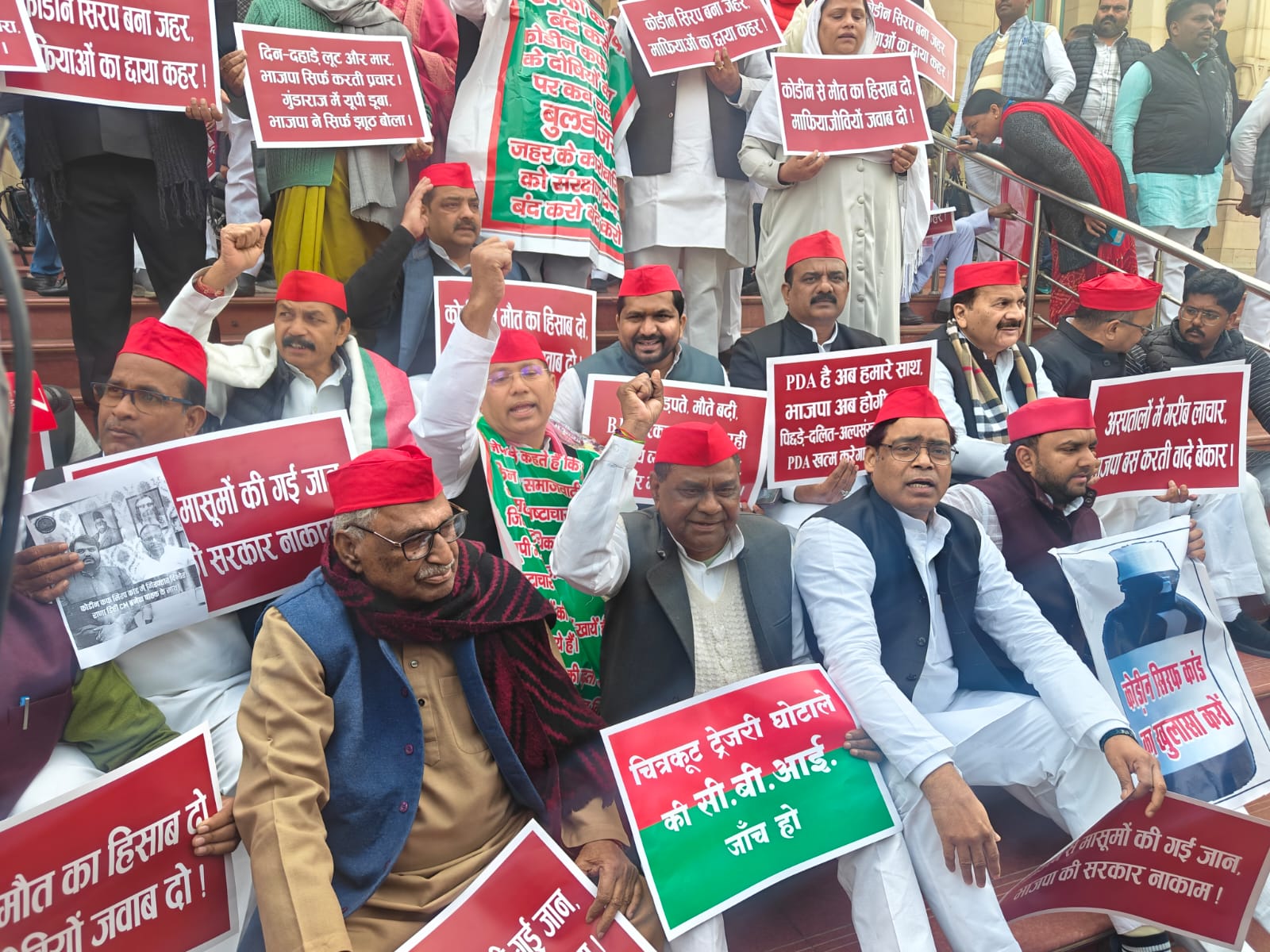 सरकार की जनविरोधी नीतियों के खिलाफ सपा विधायकों का विधानसभा में धरना