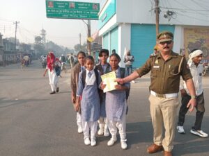 चौसाना। पुलिस अधीक्षक शामली श्री एन.पी. सिंह के निर्देशन तथा अपर पुलिस अधीक्षक श्री संतोष कुमार सिंह के पर्यवेक्षण में यातायात माह (नवंबर 2025) के तहत जनपद में सड़क सुरक्षा जागरूकता अभियान चलाया जा रहा है। अभियान के तहत यातायात पुलिस द्वारा चौराहों, विद्यालयों एवं सार्वजनिक स्थानों पर लोगों को हेलमेट, सीट बेल्ट, गति नियंत्रण सहित सुरक्षित यातायात नियमों का पालन करने हेतु प्रेरित किया जा रहा है।