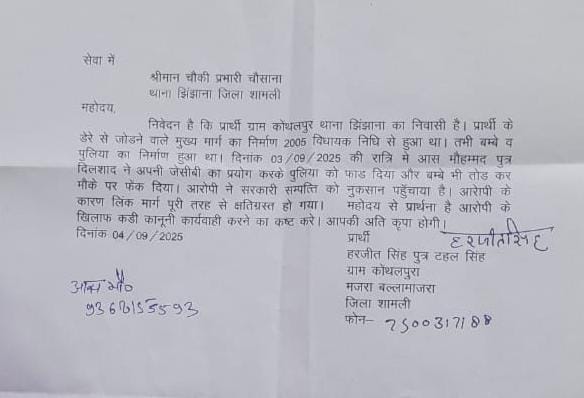 हरजीत सिंह ने आरोप लगाया कि दिनांक 03 सितंबर 2025 की रात आस मोहम्मद पुत्र दिलशाद ने अपनी जेसीबी से पुलिया को तोड़ दिया और बम्बे भी मौके पर फेंक दिया। इससे लिंक मार्ग पूरी तरह क्षतिग्रस्त हो गया। प्रार्थी ने पुलिस से आरोपी के खिलाफ सरकारी सम्पत्ति को नुकसान पहुँचाने के मामले में कानूनी कार्रवाई करने की मांग की है।